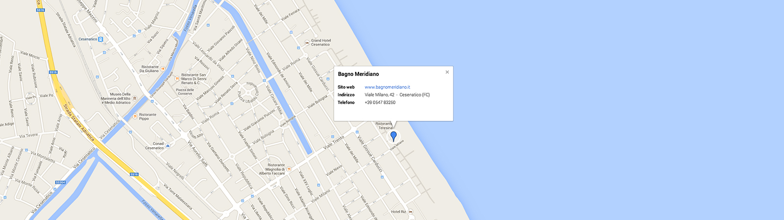 Il Bagno Meridiano si colloca nella zona Levante di Cesenativo (FC) in Viale Milano, a ridosso dei Giardini del mare situati sulla fascia costiera ex demaniale, completamente adibita a parco pubblico e dotata di numerosi parcheggi auto.